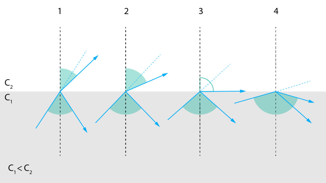 If the angle of incidence surpasses the critical angle, the light ray will bend so much that a phenomenon called “total internal reflection” occurs. Total internal reflection means the light bounces back into the first medium (the core), which is exactly what we need. Image 4 in the diagram below shows total internal reflection: