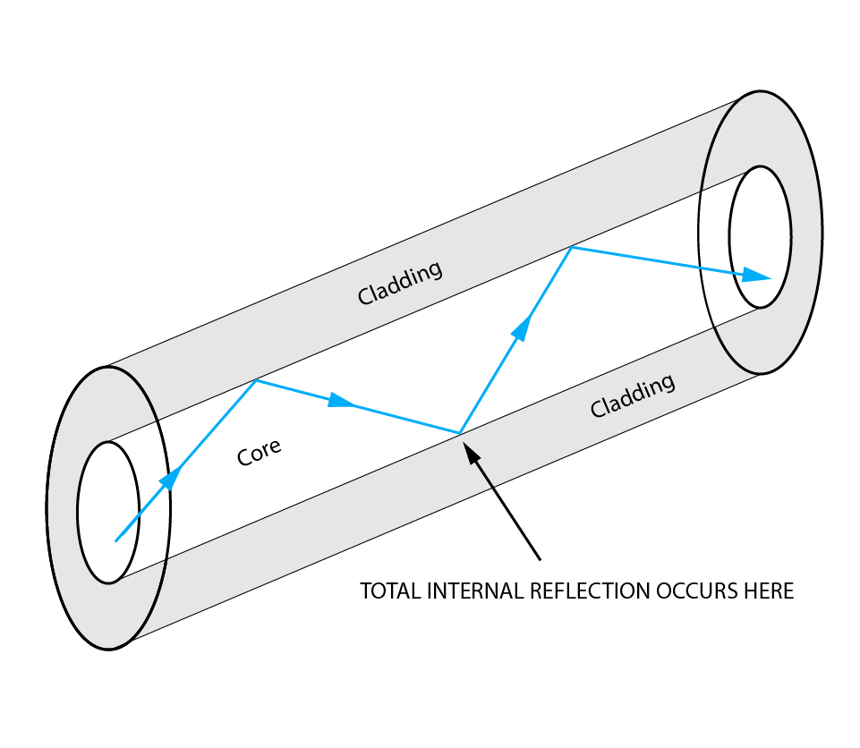 So, what does refraction have to do with our fiber optic cable? We don’t want the light to go through the cladding and out at a different angle. We want to keep it inside the core.