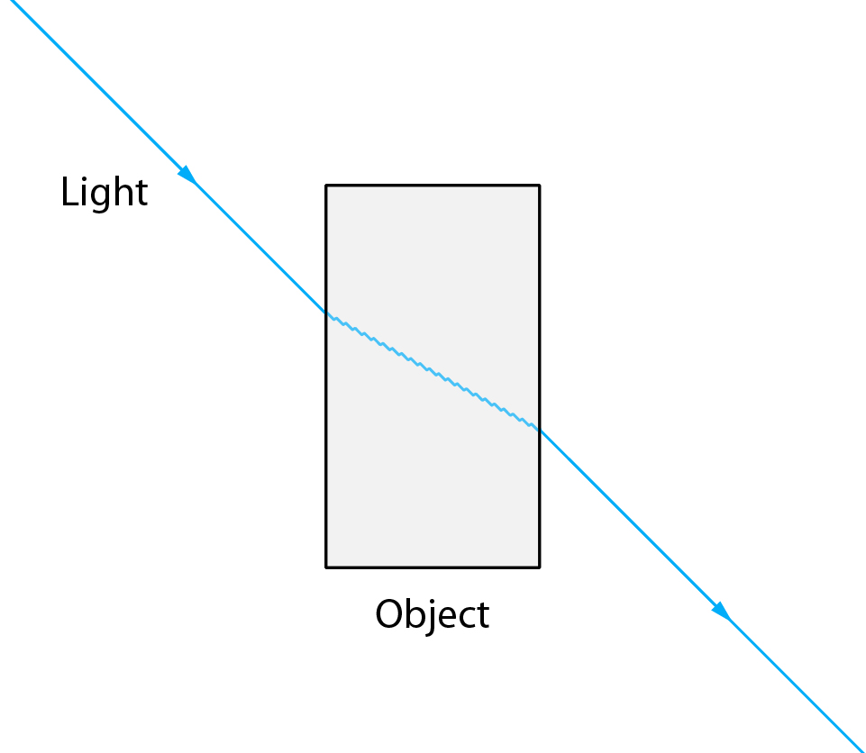 When you think about refraction, you usually visualize light entering from the air into glass or water and changing its angle. This happens because both glass and water are denser than air and have higher refractive indexes, so light travels slower when passing through them. This change in speed is what causes the change in angle. When light exits the denser medium and goes out into the air again, it gains speed, and the angle changes back to its original degree, as seen in the image: